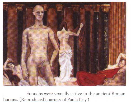 La castración de adolescentes pre-puberales y el fenotipo eunucoide logrado, fue utilizado también por el imperio romano para que estos hombres fueran los guardianes de los harenes debido a su dócil personalidad y contracepción asegurada. Esto hacia de ellos guardianes ideales y en el caso de transgresiones no resultarían en embarazos ilícitos ( Fig 4) |