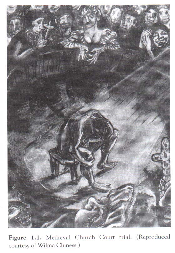 La humillación ha sido siempre una forma de control social, y muchos hombres han sido ridiculizados y destruidos por la exposición publica de su impotencia, de hecho la iglesia medieval utilizó esta estrategia en el siglo XVI, con la formación de jurados eclesiásticos para determinar la impotencia de un hombre. Mujeres acusadoras de sus maridos, y disputas de paternidad eran llevadas ante estos tribunales, el cuál demandaba al acusado probar en público su capacidad de erección y eyaculación. Tan grande era el regocijo del público, que género temor entre los hombres, mientras que la iglesia se confería inmenso poder a través de estas humillaciones. Fue allí que en respuesta de la lucha de poderes entre la iglesia y el estado que un alto tribunal de Paris abolió estos avergonzantes tribunales en 1677. (Fig 3) |